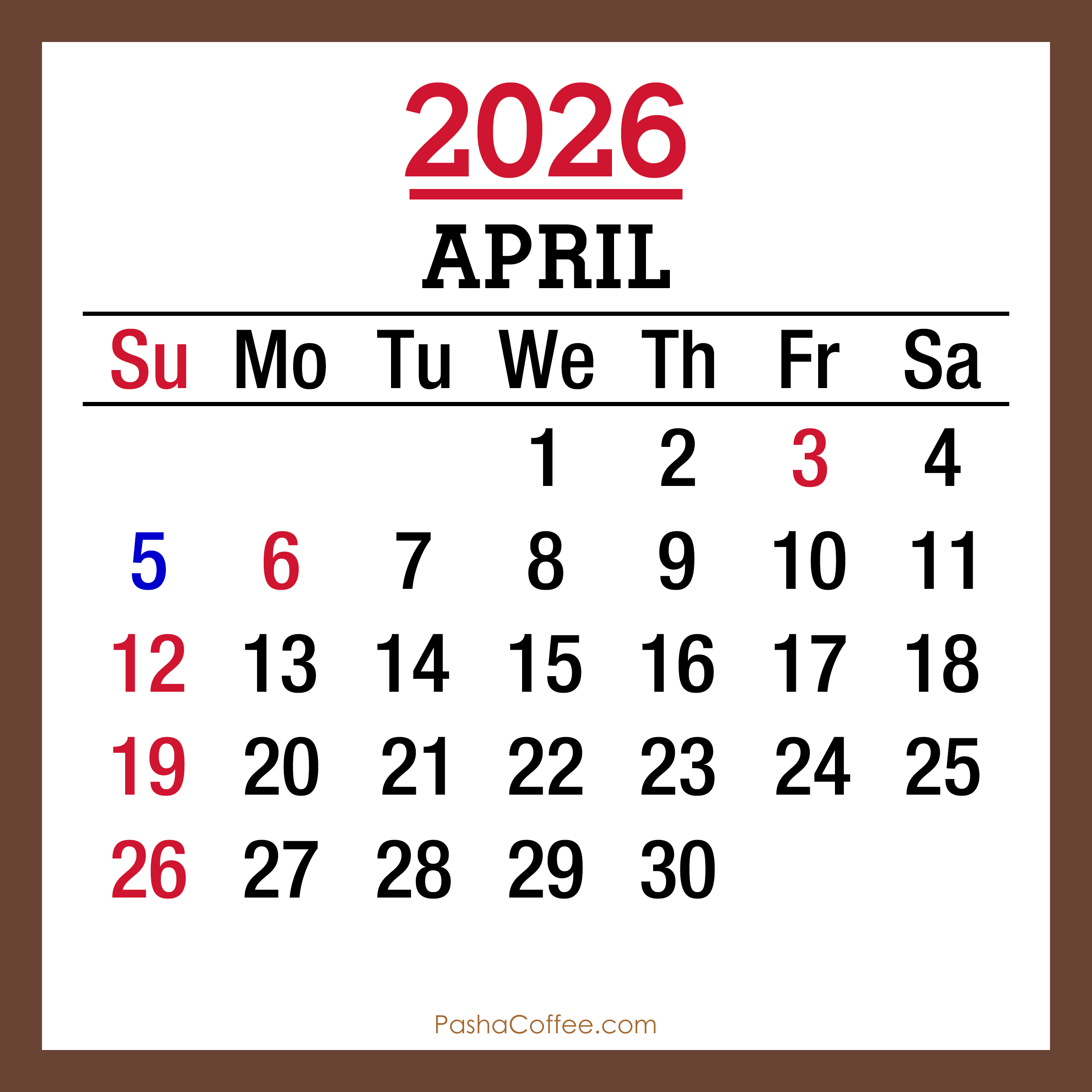 Free 2026 Printable Monthly Calendar, Brown