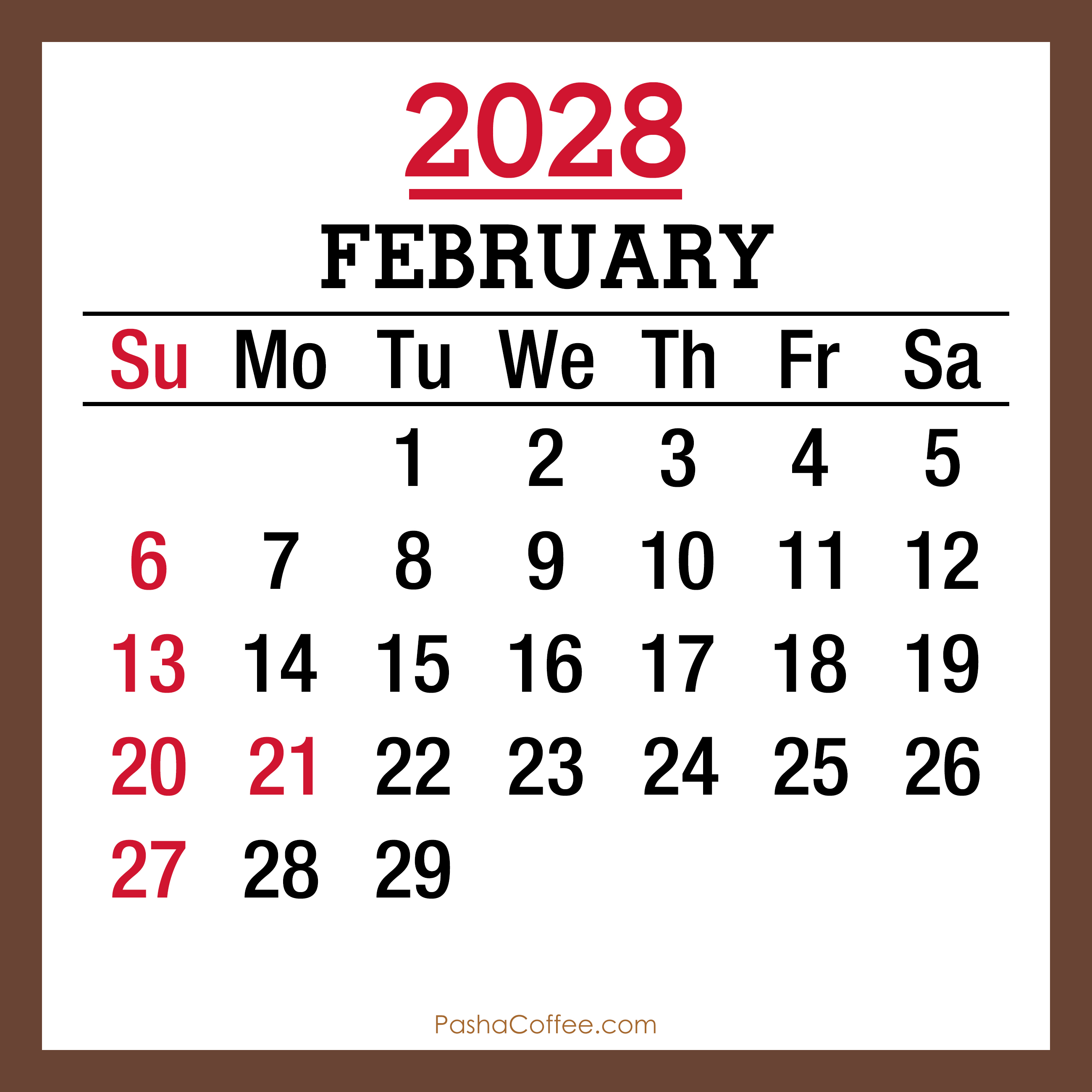 Free 2028 Printable Monthly Calendar, Brown