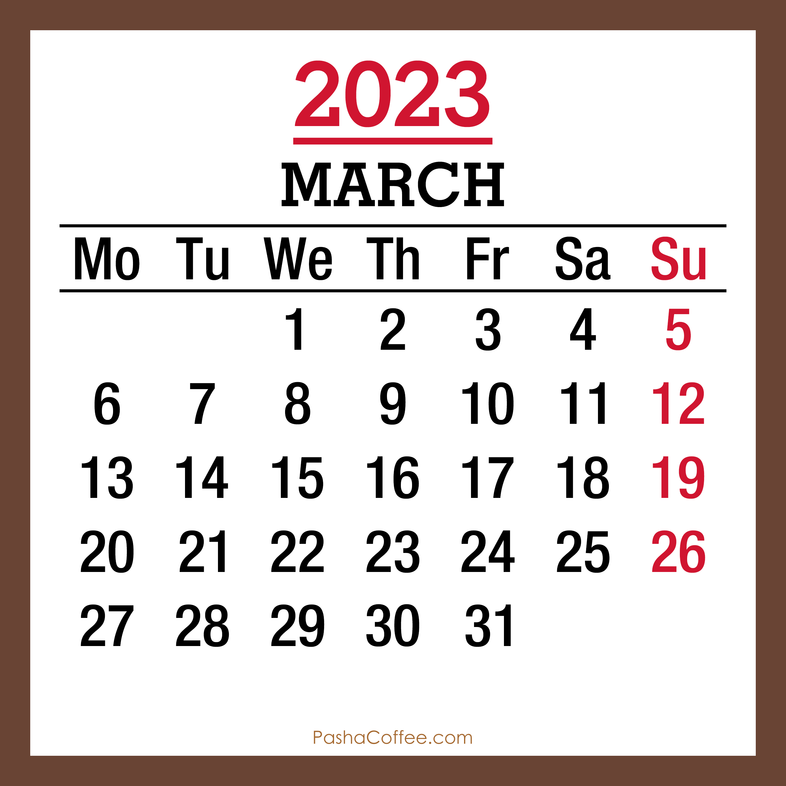 March 2023 Monthly Calendar, Printable Free, Brown, Monday Start