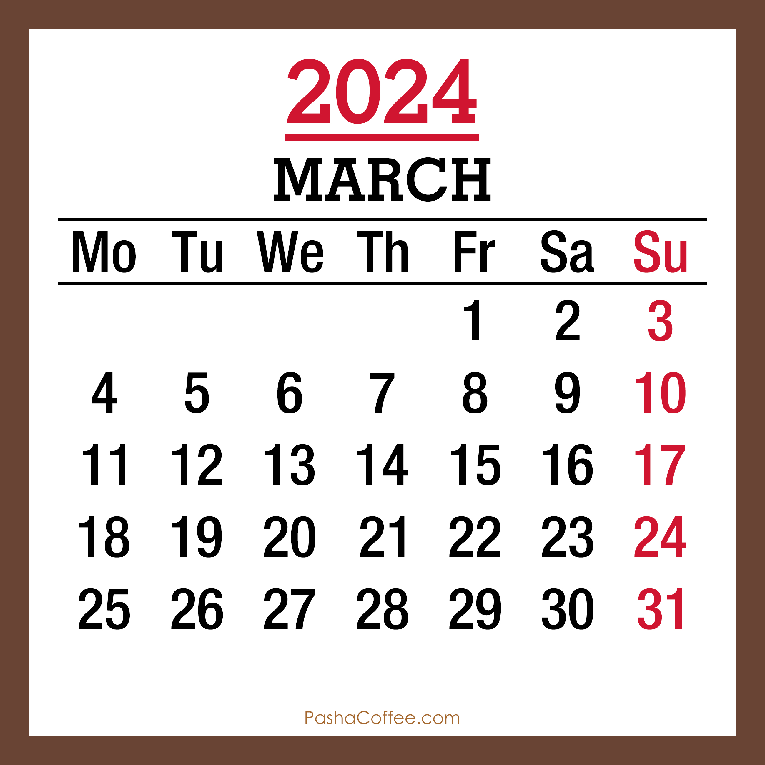 March 2024 Monthly Calendar with Holidays, Printable Free, Brown, Monday Start